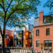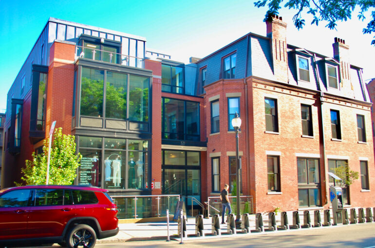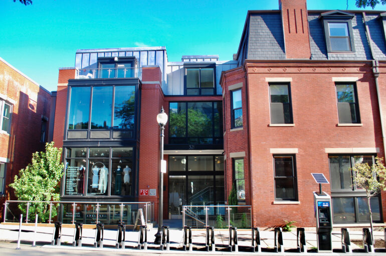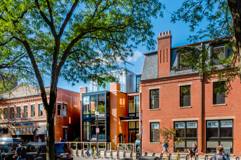 A block of brick rowhouses and their under-utilized rear yards share a corner with the vibrant and nationally known shopping boulevard Newbury Street offered a very rare opportunity to build an infill building. The design shares the influences of the historic townhouses, as well as the row of carriage houses turned retail and offices on the street, in a modernist interpretation. Utilizing 2 of the houses to combine with the infill, a fully accessible 4 stores and office space above combined building was created, with the main entry being on Newbury, with its address as 321, with great visibility for the stores, their own entries from the street, and good exposures, sun and views for the offices.