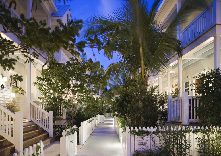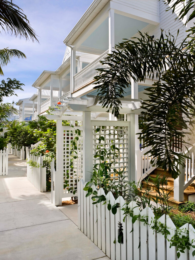 Working with our developer client, we came up with a unique interpretation of resort housing in replacing a run-down hotel on a valuable site. Our design is comprised of three-story townhouses—148 guest rooms in total—in the vernacular Conch-house style of Old Town Key West. The townhouses, each containing one standard hotel room and one two-level suite, surround a dense, lush courtyard with palm trees, swimming pools and a cafe. Trellised entryways, picket fences and arbors lend charm to the landscaped grounds, while oceanside rooms open onto porches and private, white-sand sunbathing terraces.
